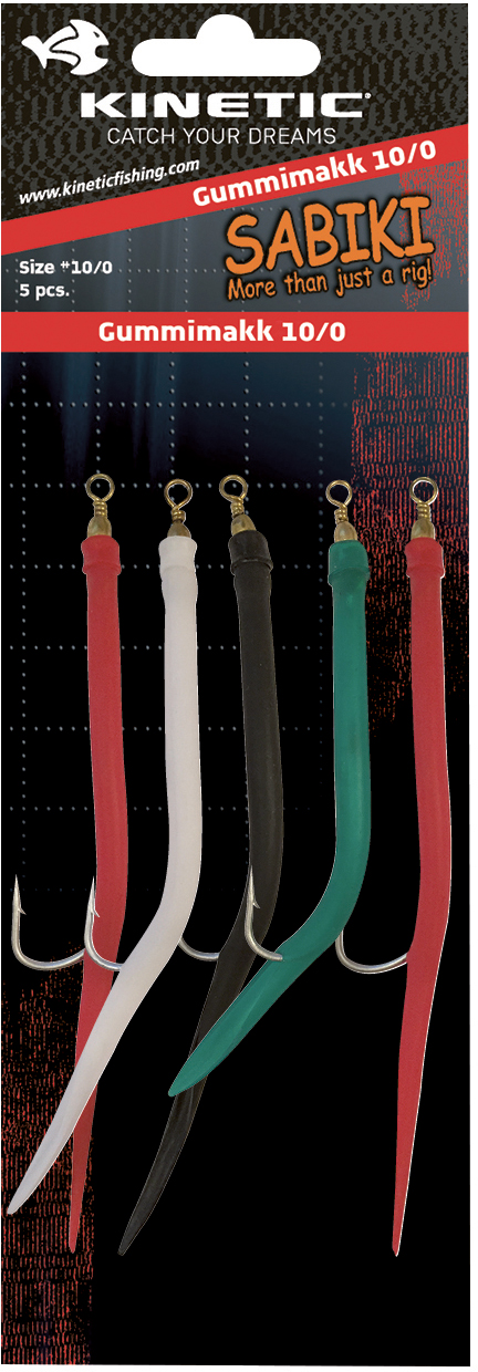 Denne blandingen av gummimakk i fargene rød / hvit / grønn / sort dekker de mest vanlige farger for effektivt nordisk sjøfiske fra båt. Med fire størrelser fra 4/0 til 10/0 kan du velge både farge og størrelse du ønsker.