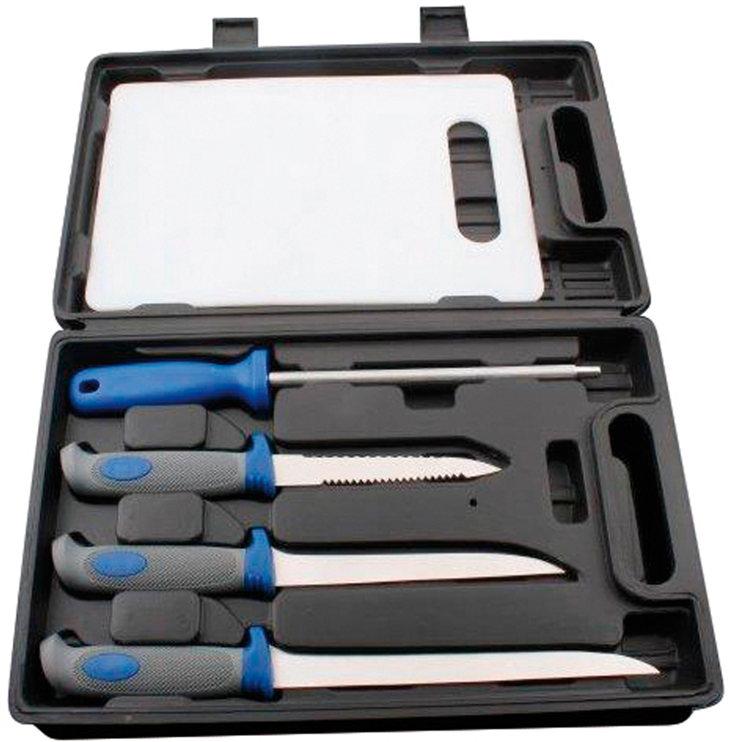 Knivsett for fiskere! Denne grove plastboksen har tre forskjellige kniver og en knivsliper vedlagt i esken.
